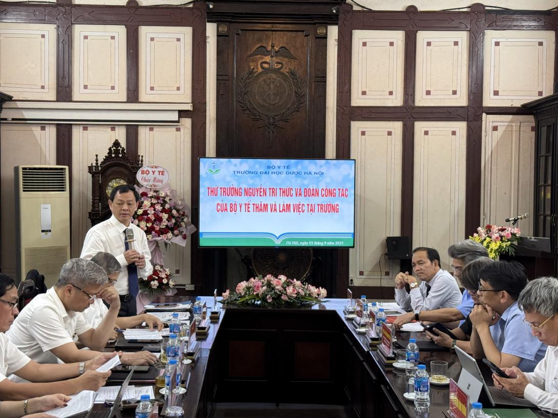 Trong khuôn khổ buổi làm việc tại Trường Đại học Dược Hà Nội, lãnh đạo Bộ Y tế đã đánh giá cao và ghi nhận những kết quả nhà trường đạt được trong công tác đào tạo, nghiên cứu khoa học và hợp tác quốc tế. Đồng thời, Bộ Y tế định hướng nhà trường tiếp tục đẩy mạnh đào tạo dược lâm sàng và quản lý dược, đáp ứng yêu cầu thực tiễn của hệ thống y tế, đặc biệt là khối bệnh viện.